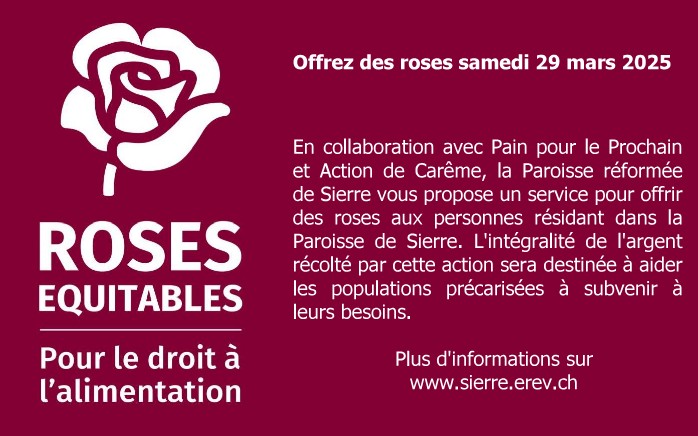 En collaboration avec Pain pour le Prochain et Action de Carême, la Paroisse de Sierre participe à l’Action des Roses de Carême qui aura lieu le samedi 16 mars 2024. À cette occasion, nous vous proposons un service pour offrir des roses aux personnes résidant à Sierre et dans les villages de la Paroisse de Sierre. L’intégralité de l’argent récolté par cette action sera destinée à aider les populations précarisées à subvenir à leurs besoins.