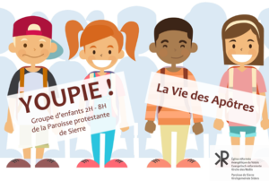 La Paroisse protestante de Sierre propose aux enfants des classes 2H à 8H de participer au groupe « Youpie ». Lors des activités Youpie 2025-2026, les enfants découvriront la Vie des Apôtres et la foi chrétienne en partageant ensemble diverses activités, telles que des chants, bricolages, histoires, jeux et célébrations.